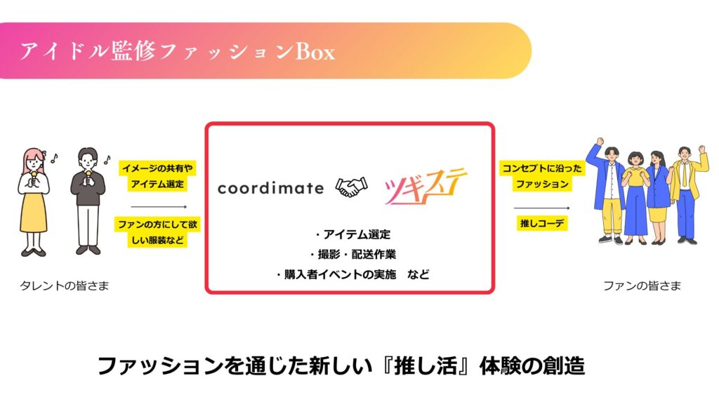 株式会社ツギステ(所在地:東京都渋谷区、代表取締役社長:橋本ゆき)は、NTTドコモグループ※1の新規事業創出プログラム「docomo STARTUP」を通じてスピンアウト※2した株式会社coordimate(所在地:東京都渋谷区、代表取締役CEO:飯野 健太郎)とアイドルが”ファンに着てほしい”コーデをプロスタイリストと監修して届ける共同企画を開始することをお知らせいたします。