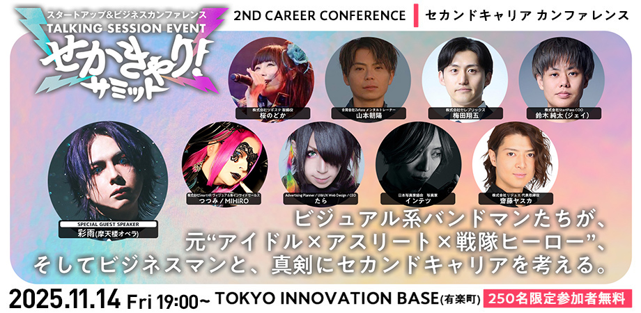 「せかきゃり!」は、元ビジュアル系バンドマンを中心に始まったセカンドキャリア啓蒙プロジェクトです。これまで多くの挑戦者が登壇し、“表現者のその先”を社会に発信してきました。この度、これまでの活動に加えて「アイドル・アスリート・俳優・ビジネスマン」など、より多様な挑戦者たちのキャリアをつなぐ取り組みとして再始動いたします。