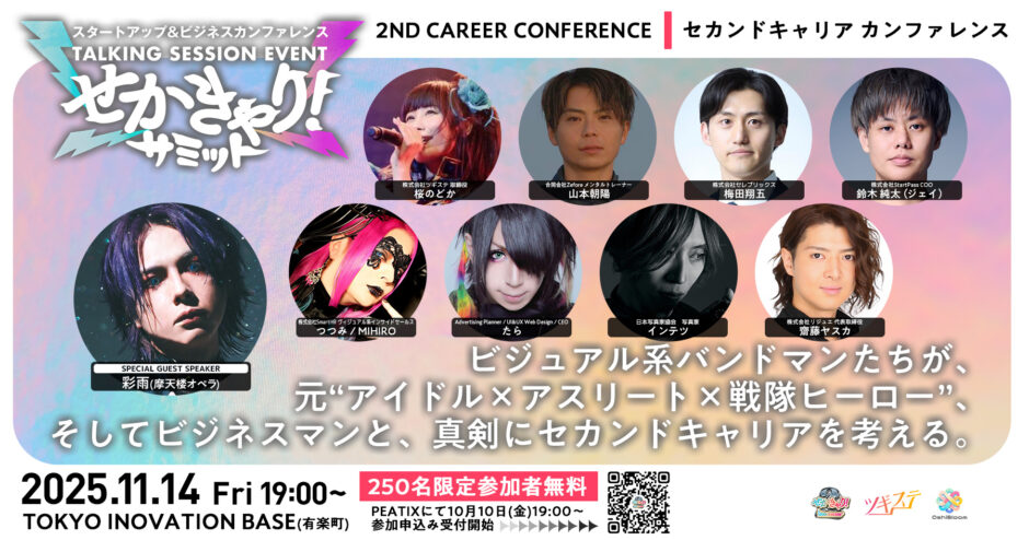 「せかきゃり!」は、元ビジュアル系バンドマンを中心に始まったセカンドキャリア啓蒙プロジェクトです。これまで多くの挑戦者が登壇し、“表現者のその先”を社会に発信してきました。この度、これまでの活動に加えて「アイドル・アスリート・俳優・ビジネスマン」など、より多様な挑戦者たちのキャリアをつなぐ取り組みとして再始動いたします。