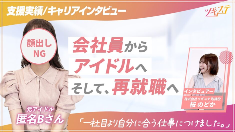 皆さん、こんにちは。株式会社ツギステの桜のどかです。本日はアイドルから正社員に就職をされた元アイドルの、Bさんにインタビューをさせていただきます。Bさん、よろしくお願いします。